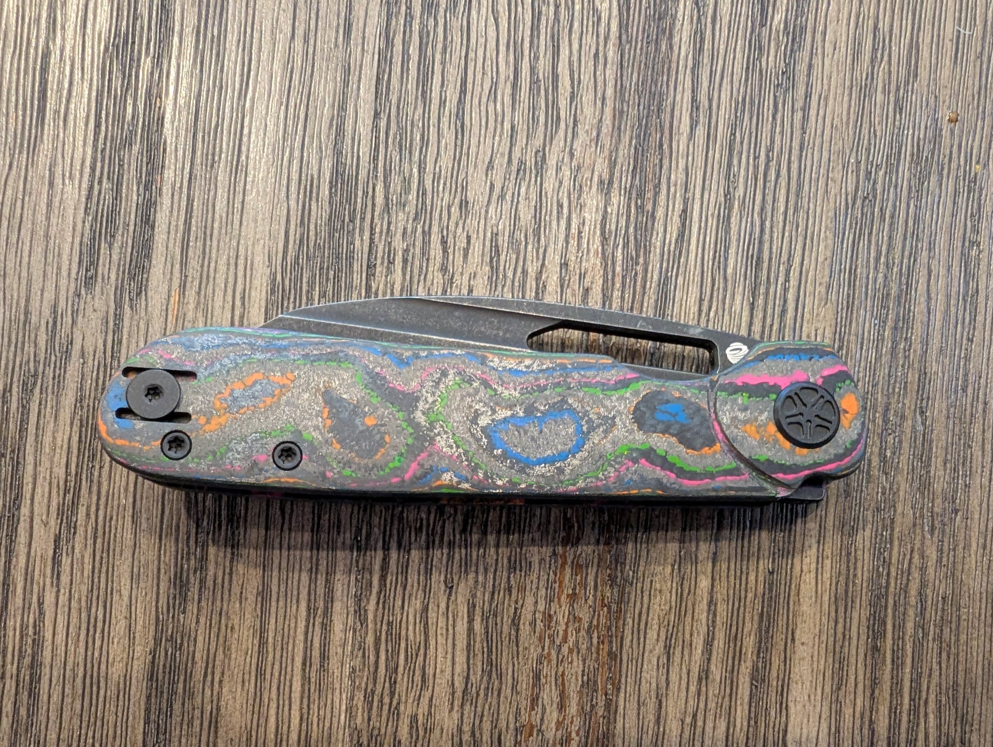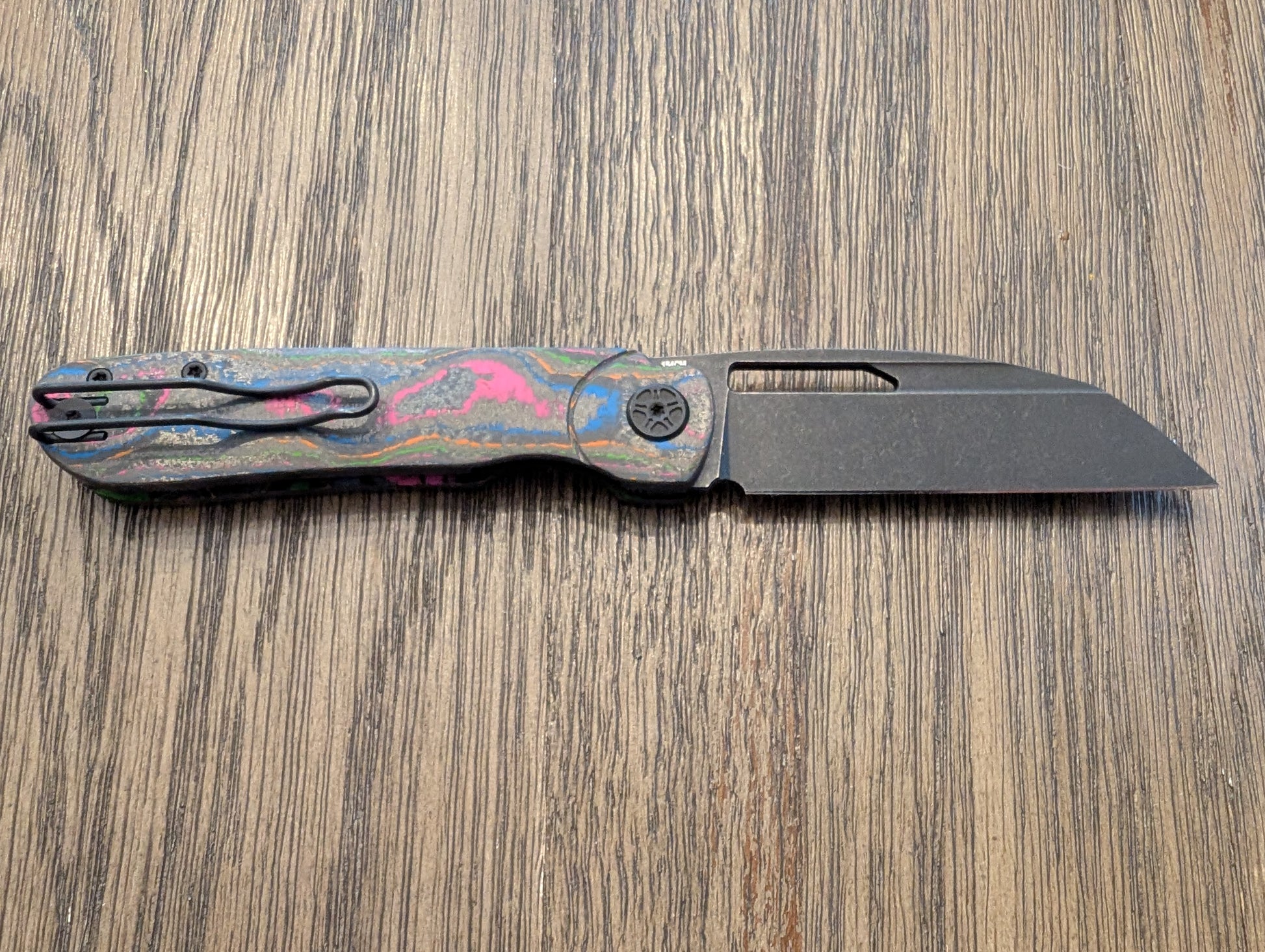 This is the Tempest Knives Downdraft Hailstorm Edition. This one has 80s Camo Carbon scales and a Blackwashed 154CM Blade