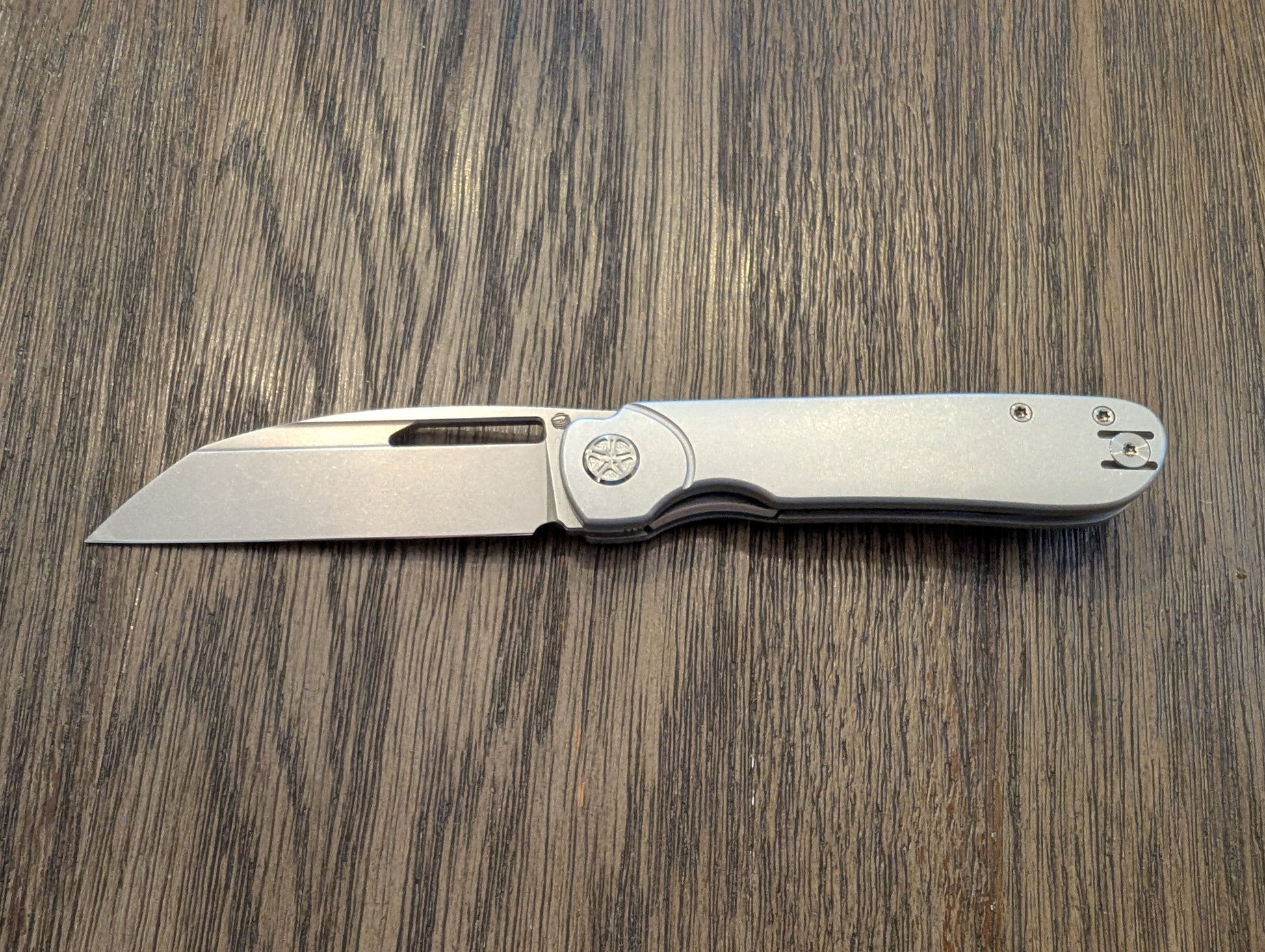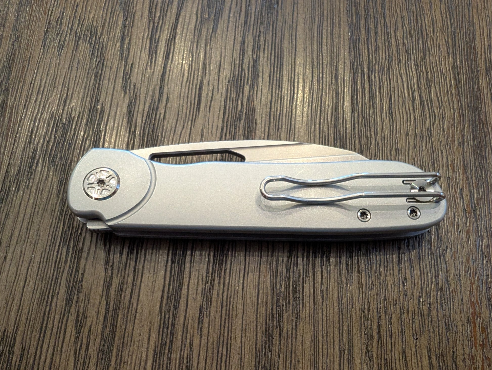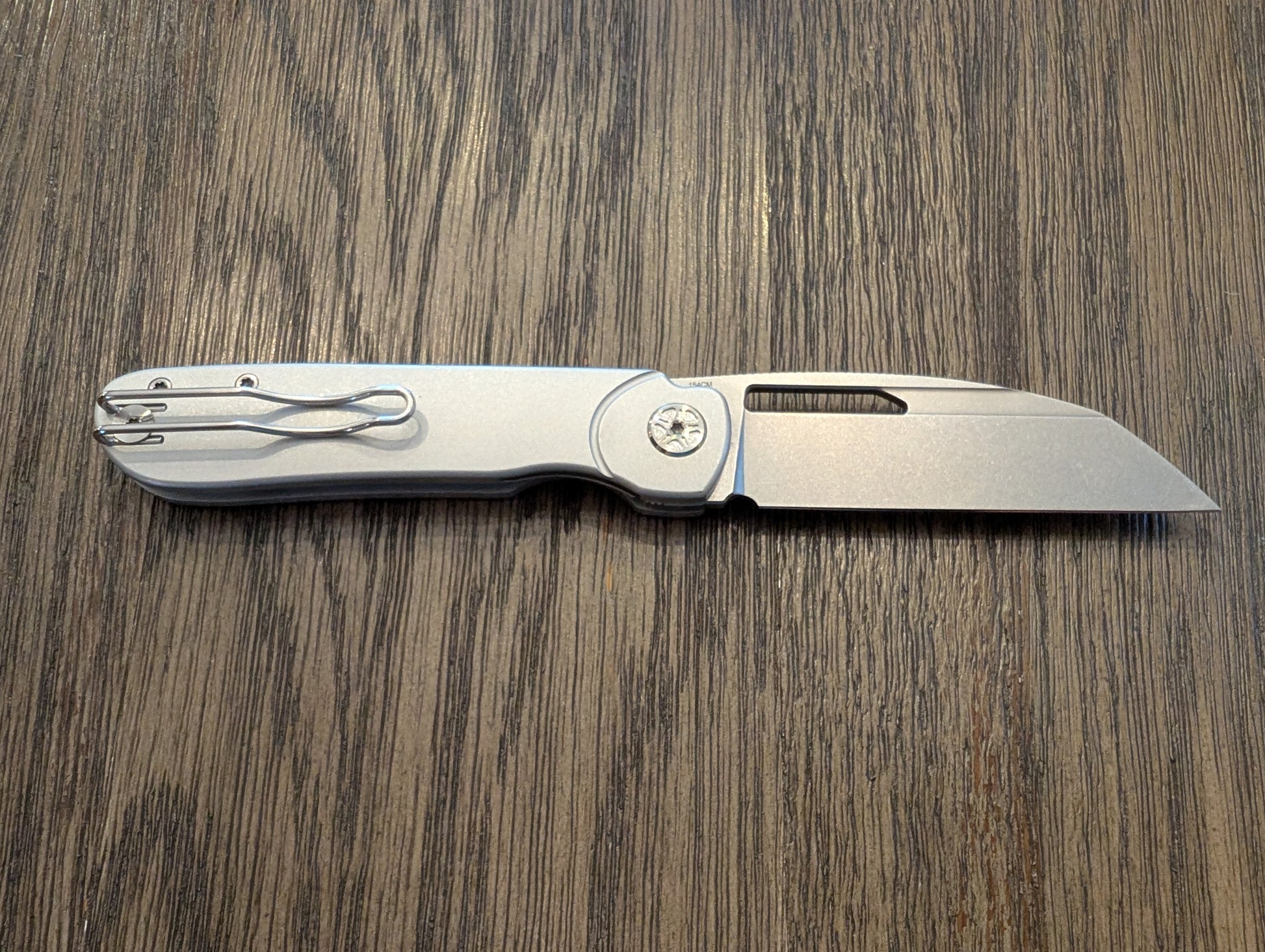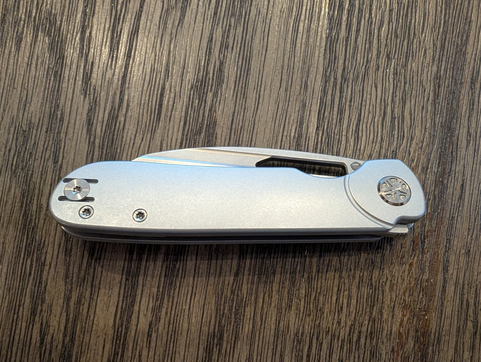 This is the Tempest Knives Downdraft Hailstorm Edition. This one has bead-blasted aluminum scales and a stonewashed 154CM Blade