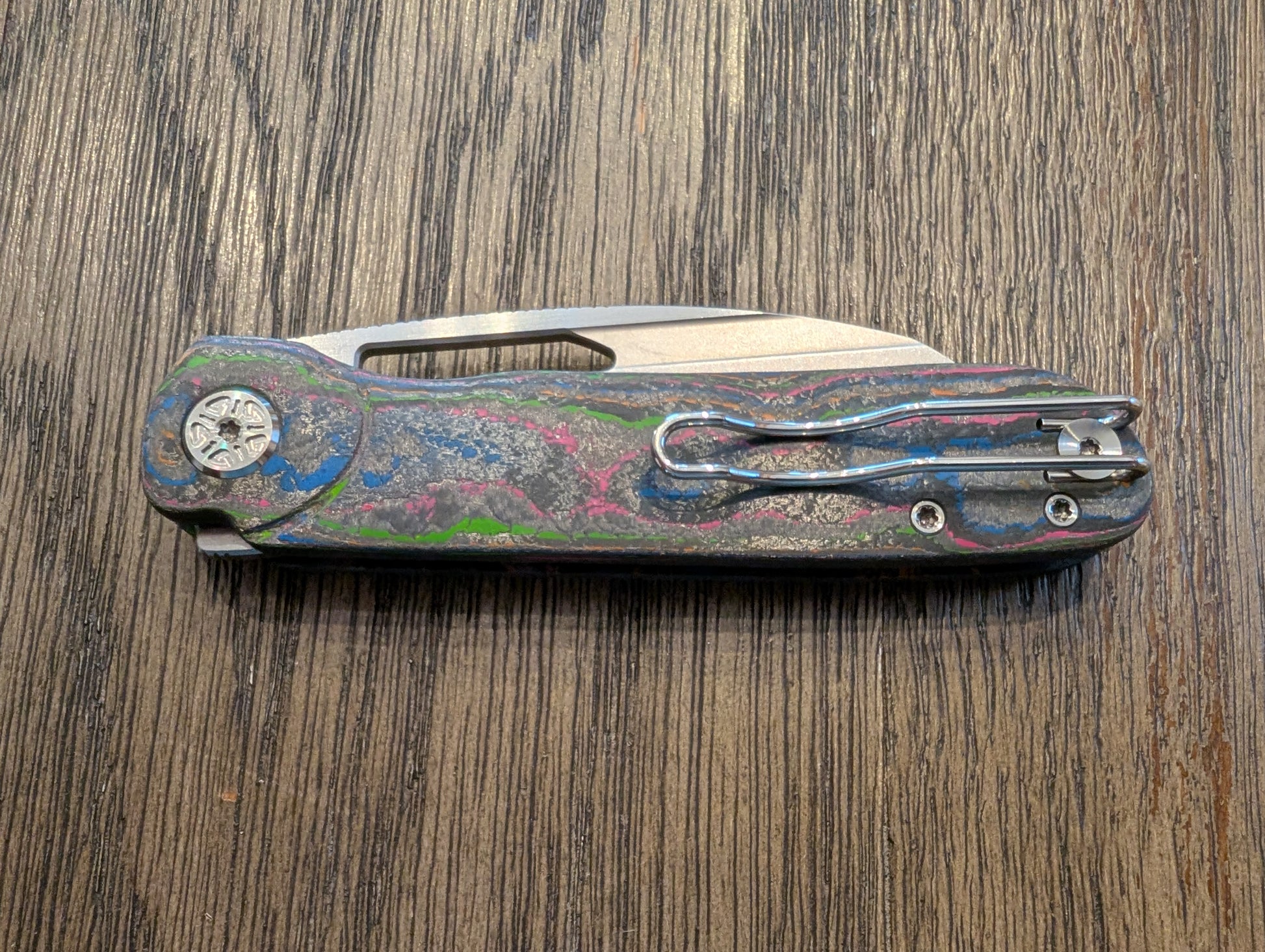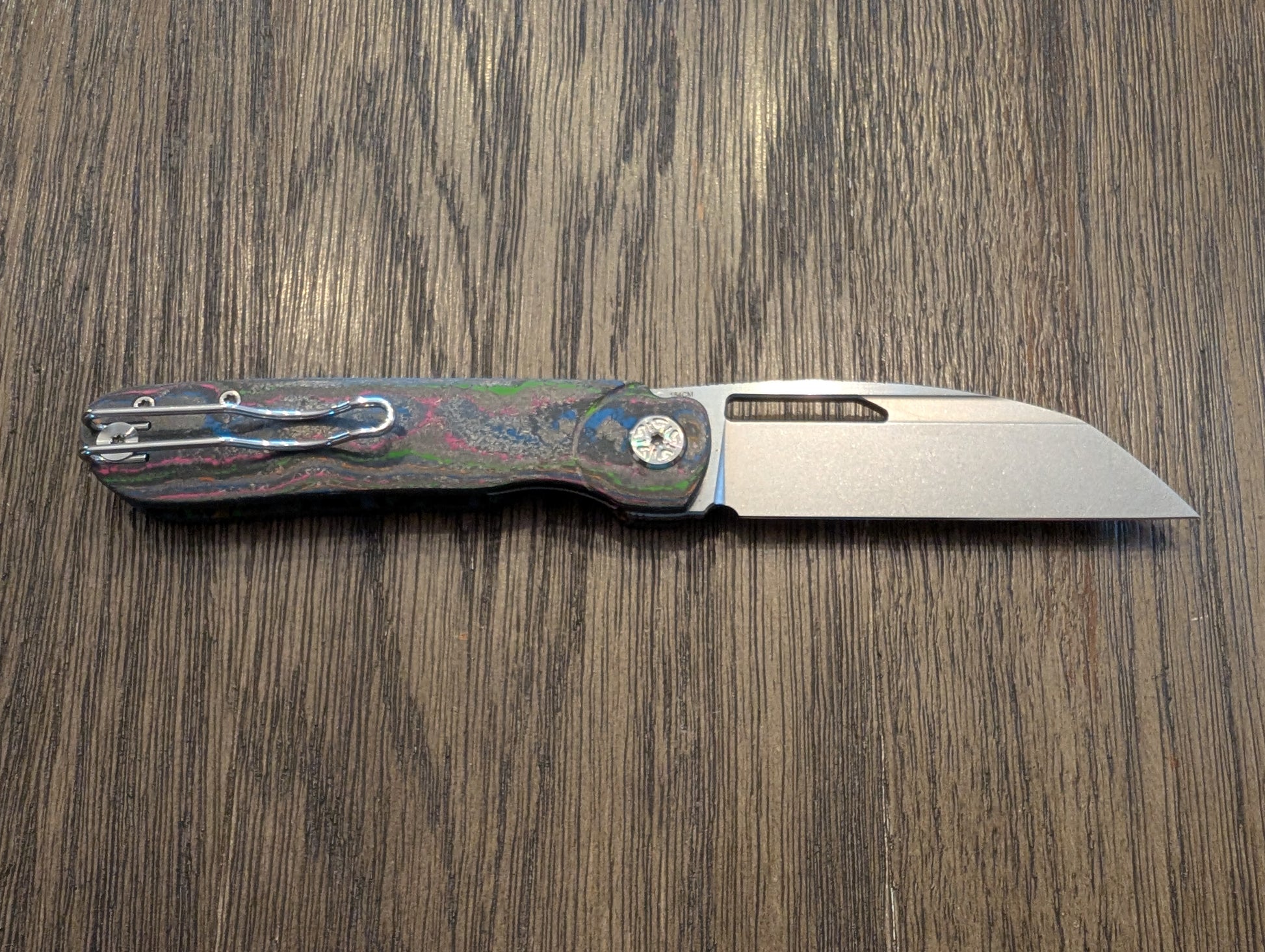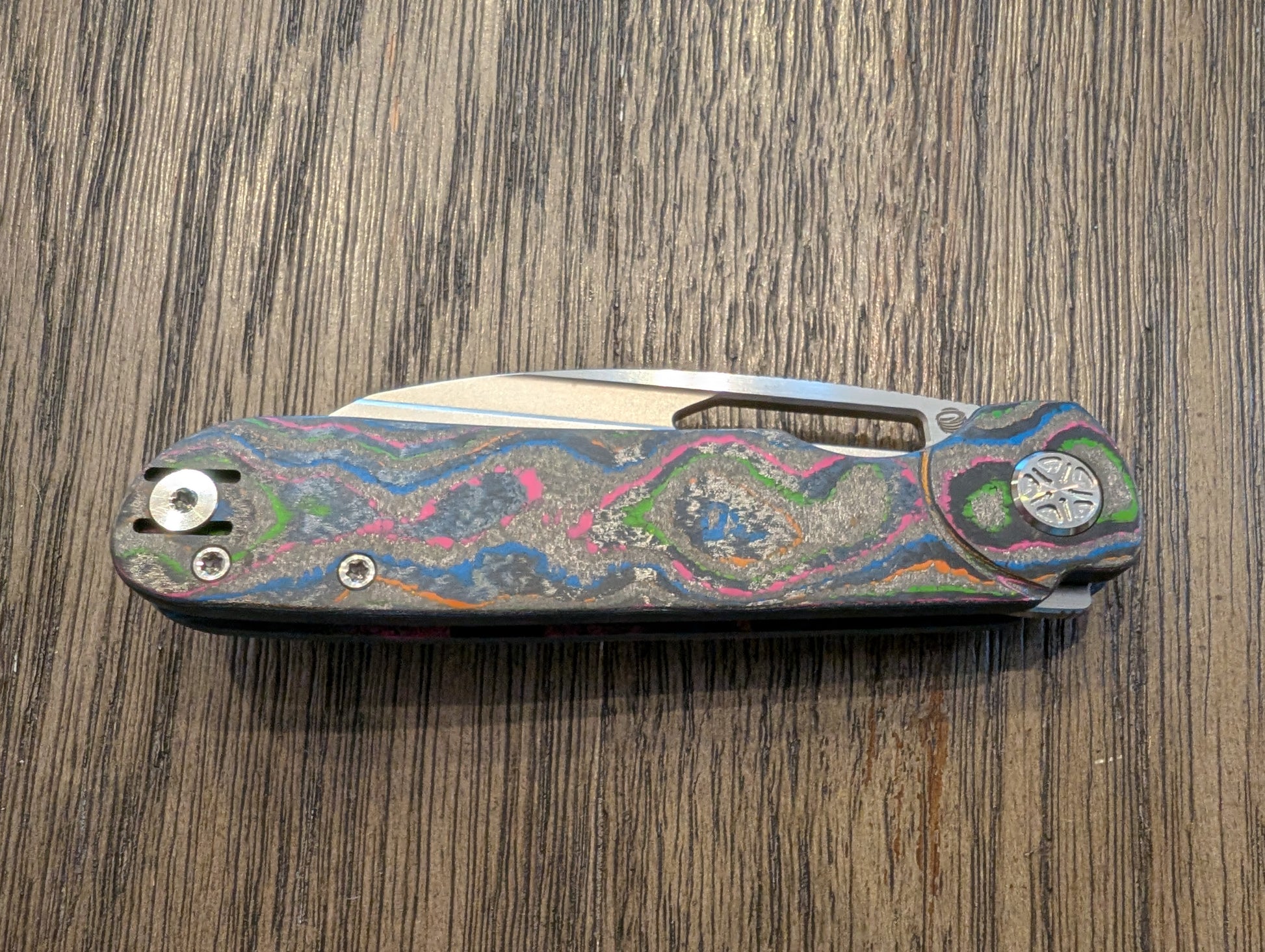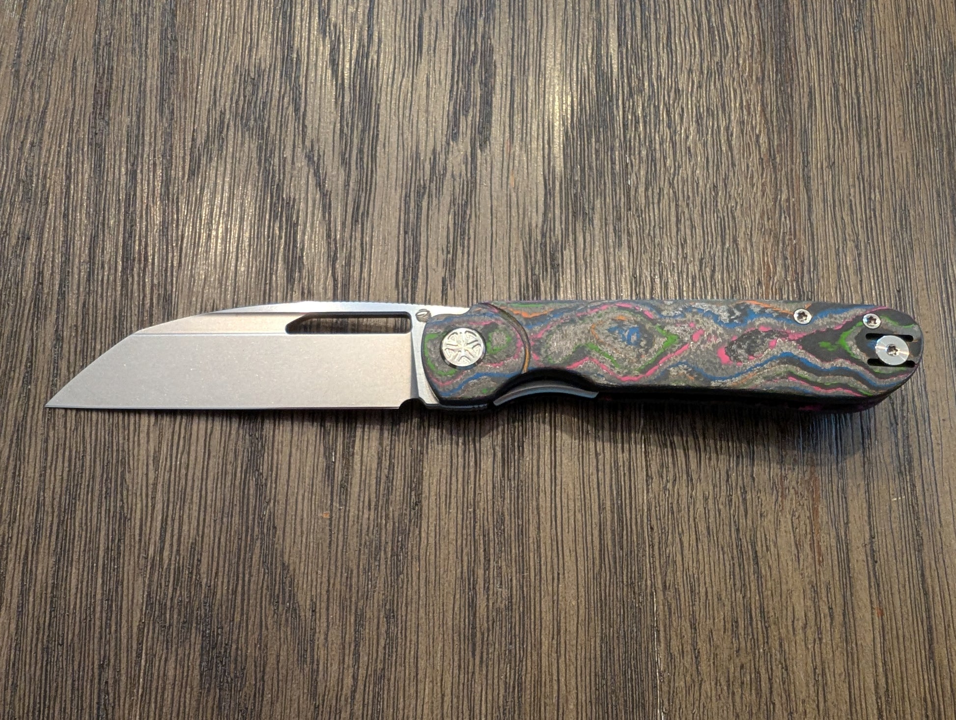 This is the Tempest Knives Downdraft Synthwave Edition. This one has 80s Camo Carbon Scales and a 154CM Blade with satin flats and a stonewashed bevel.