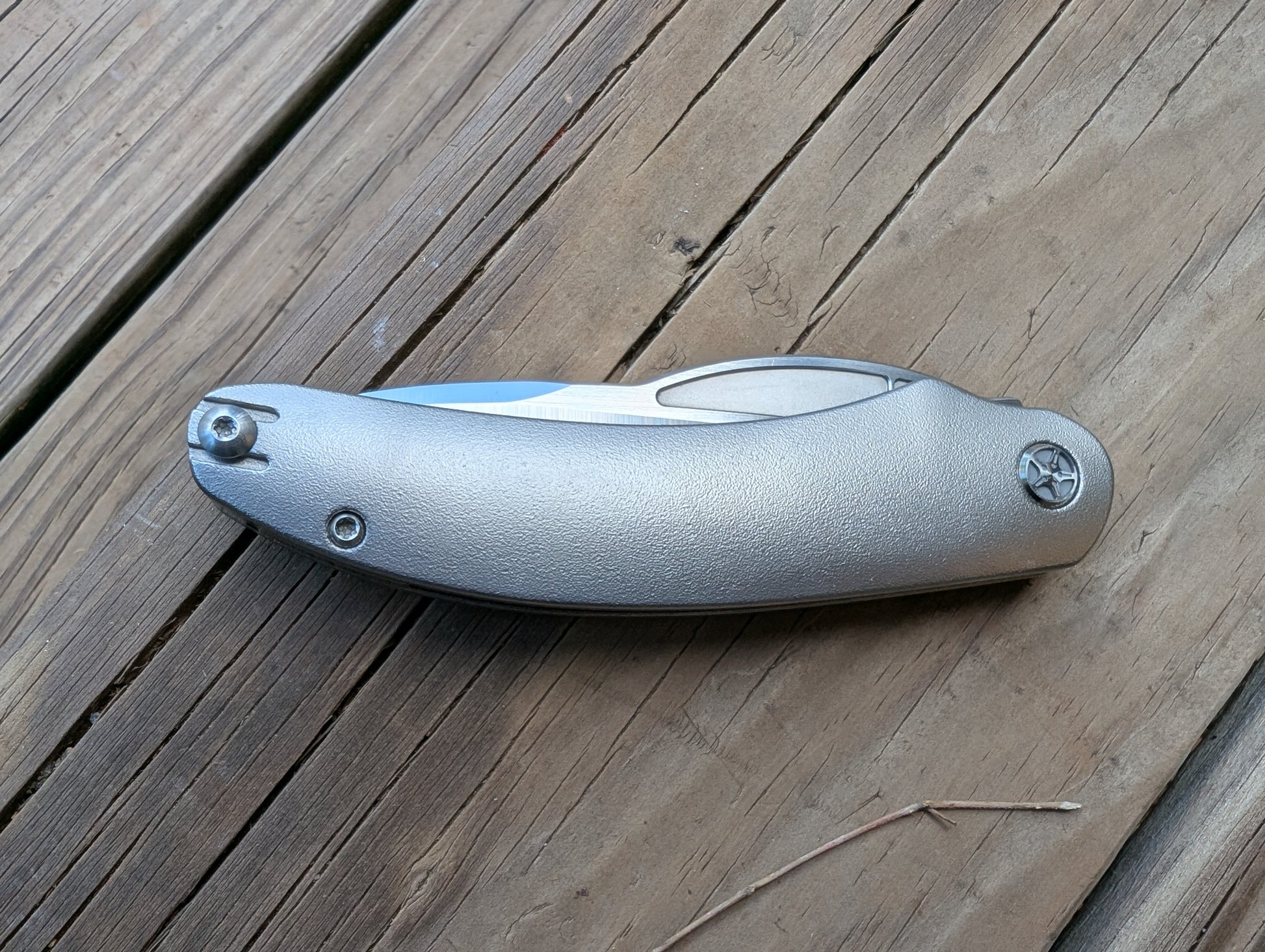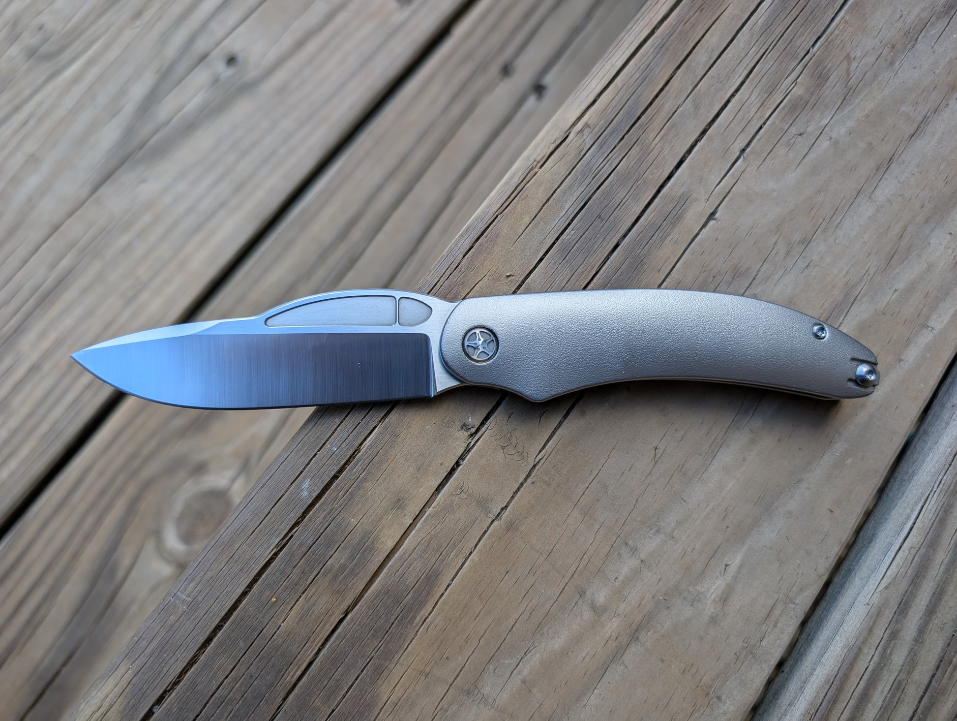 This is my First ever design. It was never produced. This is the QSP made Prototype to show the model. This was inspired by my love for the P51 Mustang WWII Fighter Plane and Fast Cars. The Pivot has stuck and been on all of my designs since, This was Orang a peel Titanium for the handle.