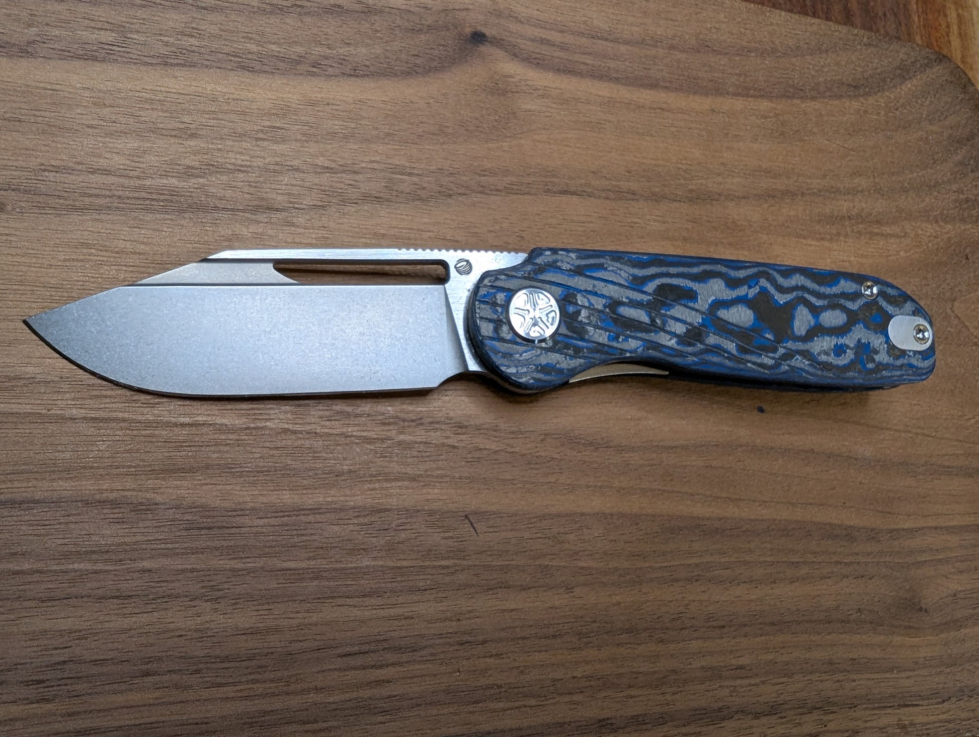 Tempest Tornado Blue Sky Version- Electric Blue Camo Carbon Handle with Milling lines, Two Tone 154CM Blade (Satin Flats, Stonewashed Bevel), Blue Anodized Titanium Clip & Backspacer. Satin Titanium Hardware.