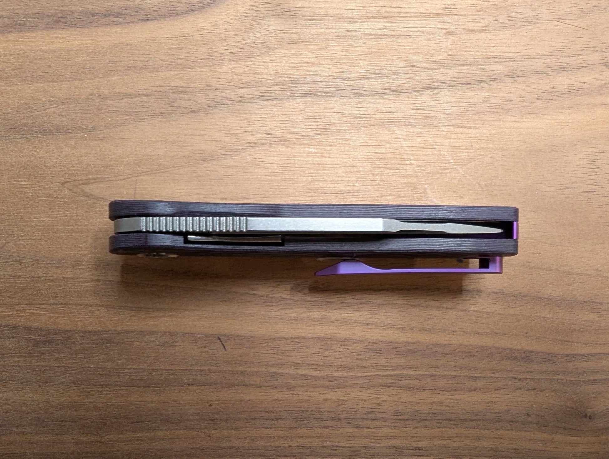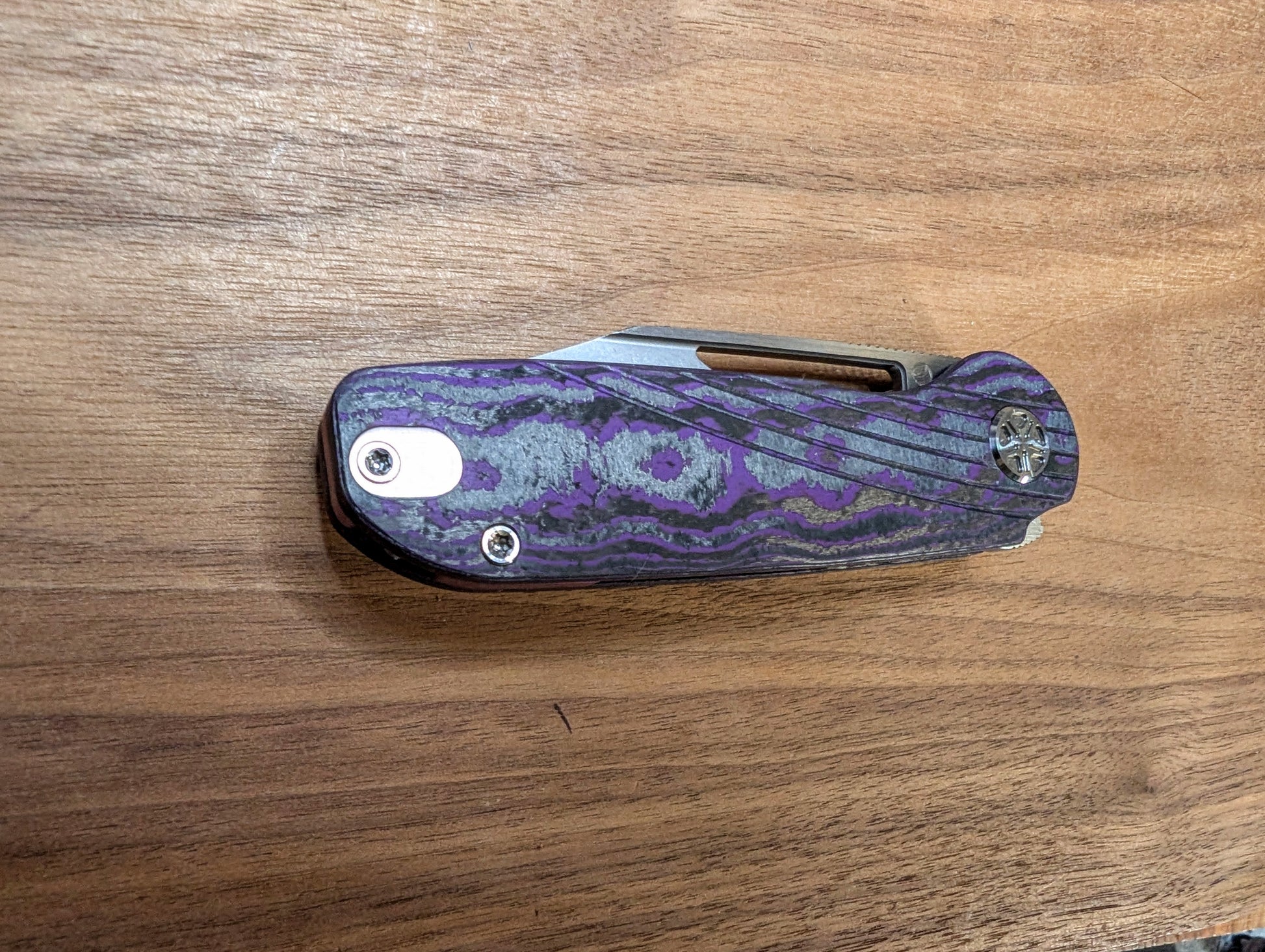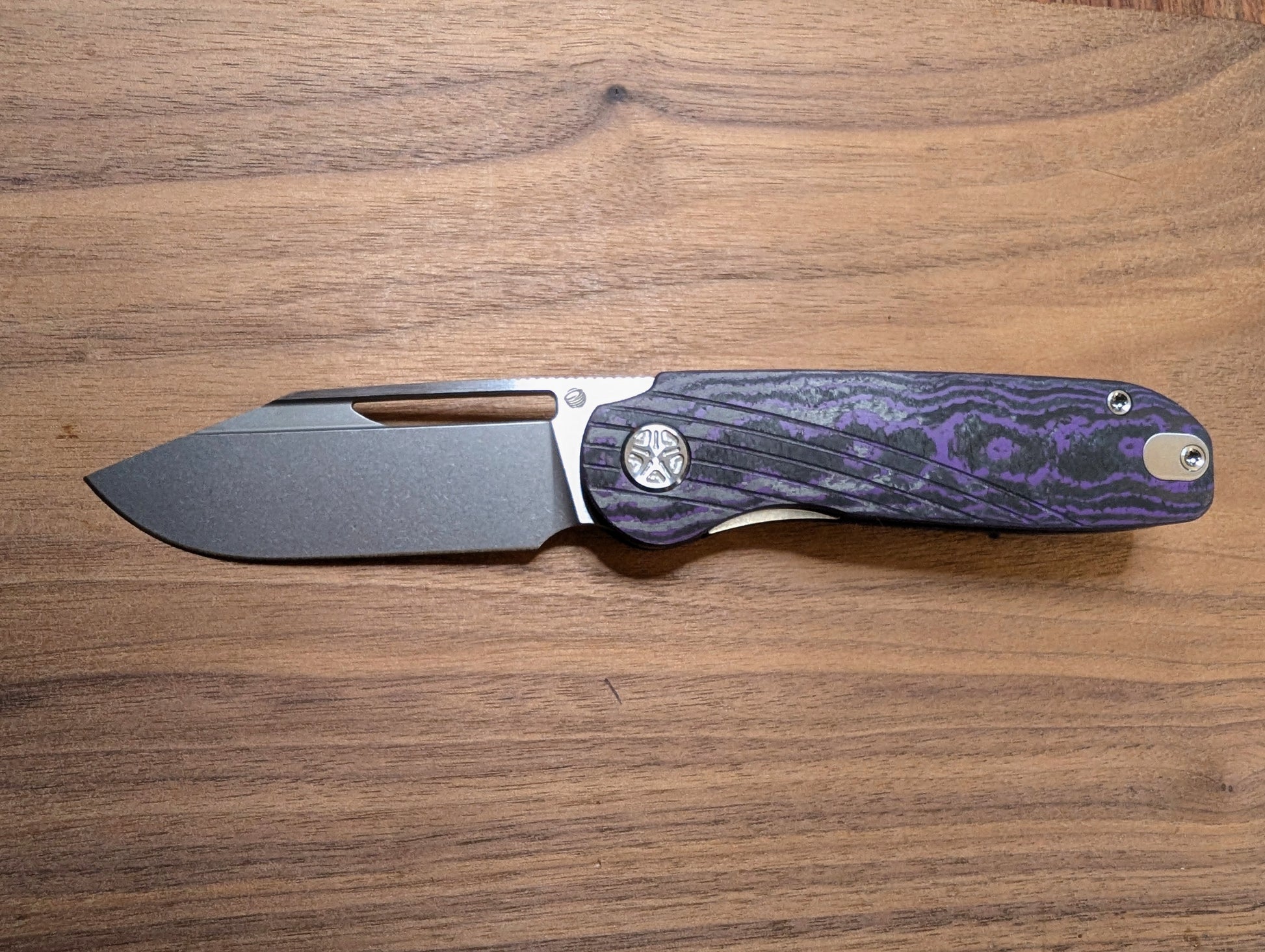 Tempest Tornado Purple Swirl Version - Purple Flow Camo Carbon Handle with Milling lines, Two Tone 154CM Blade (Satin Flats, Stonewashed Bevel), Purple Anodized Titanium Clip & Backspacer. Satin Titanium Hardware.